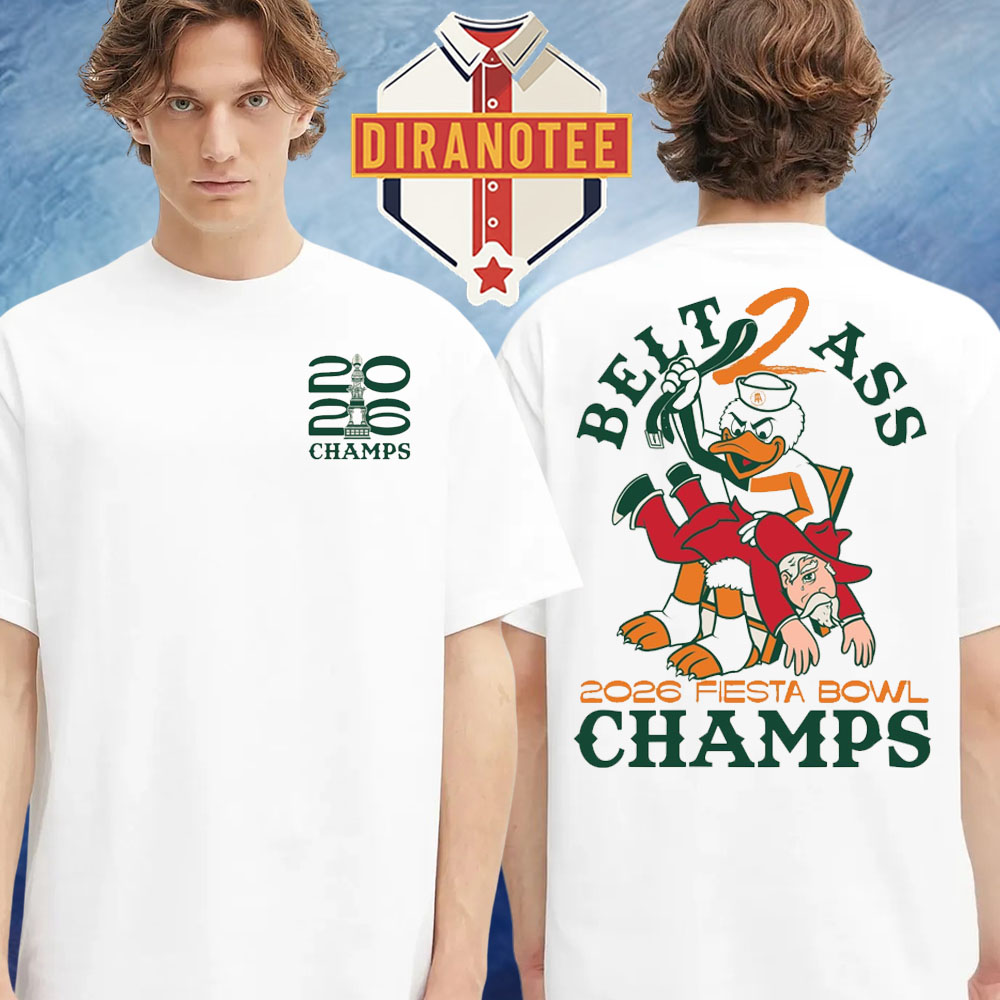 Miami Hurricanes Football Are The Fiesta Bowl 2026 Champions NCAA Football FBS “1 Belt 2 Ass” Two Sided Unisex T-Shirt Features: