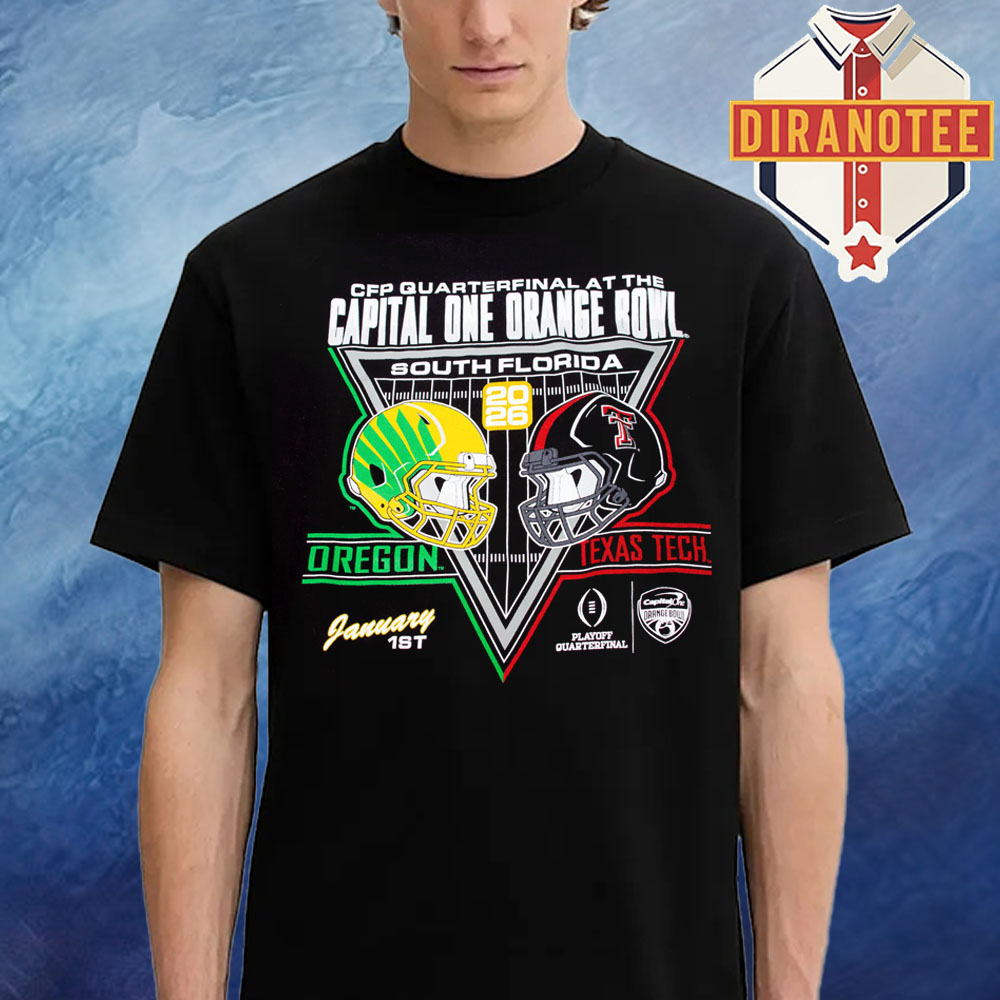 Oregon Ducks Football vs. Texas Tech Red Raiders Football Postseason 2025 R2 Helmet-to-Helmet Second Round Unisex T-Shirt Features: