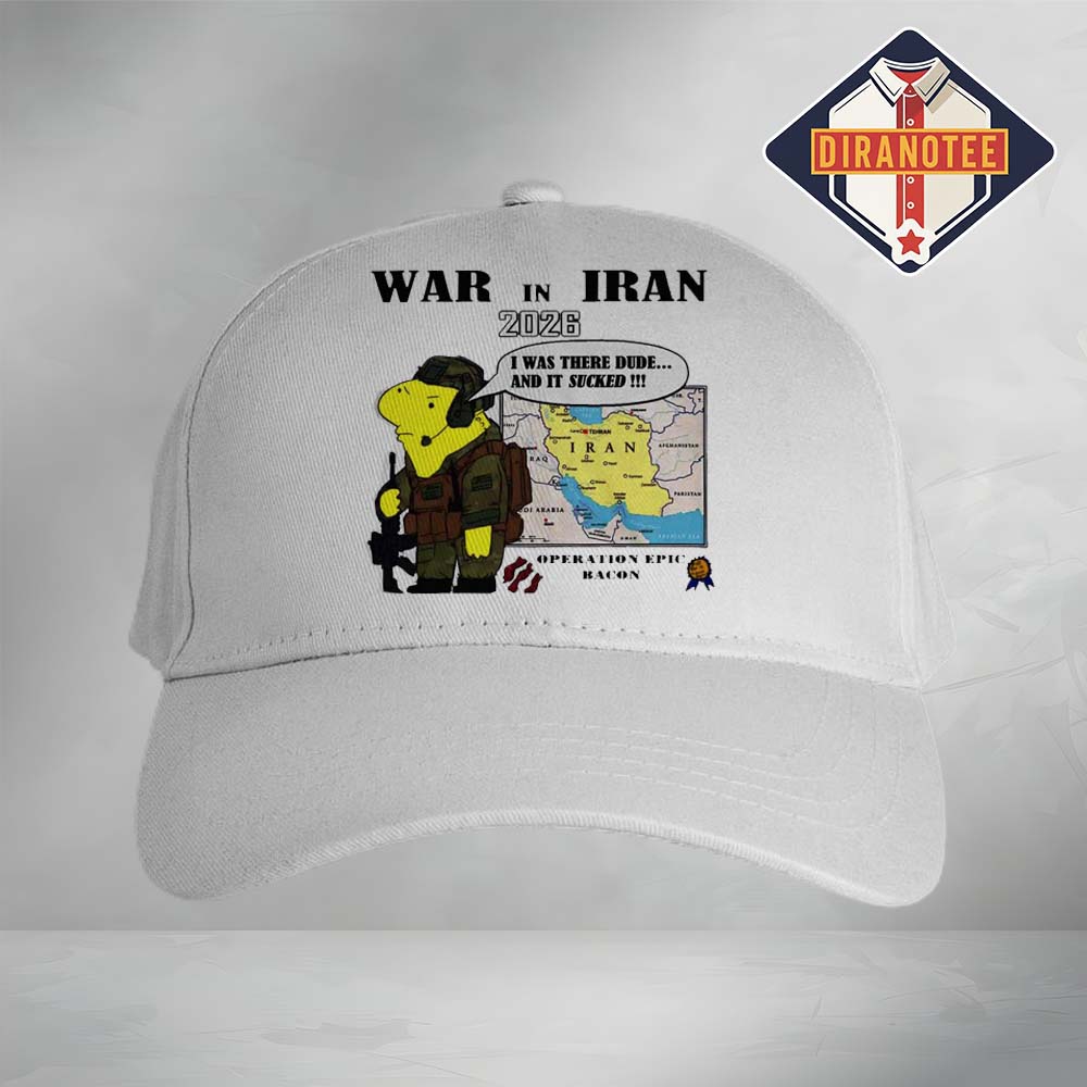 The front panel highlights War In Iran 2026 alongside Operation Epic Bacon in a clean, high-impact layout. The structured crown keeps the graphic centered and visible, making the message clear from a distance. Every detail stays focused on the title, letting the words carry the weight.